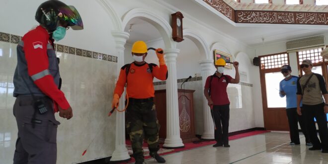 Tim Satgas Covid-19 Desa Darmakradenan, menyemprot disinfektan di Masjid Baitul Muttaqien, Dusun Pegawulan Kulon, Kamis (26/3).