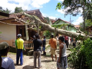 pohon yang menimpa bangunan depan rumah korban itu. Kejadian tersebut mengakibatkan angkutan di jalan desa tersendat. Kabel jaringan listrik dan telepon juga ikut terputus.